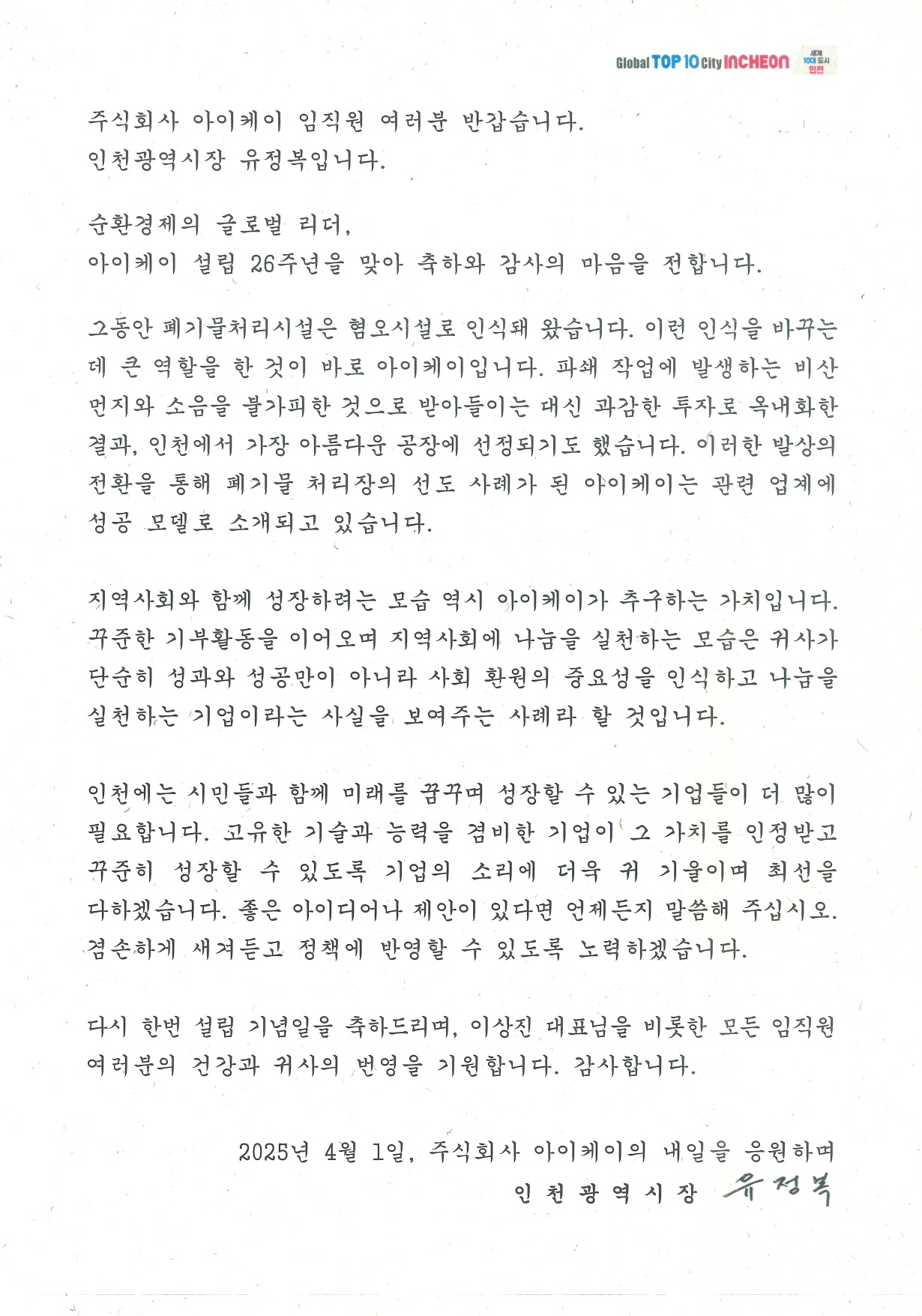 소식 인천광역시 유정복 시장의 아이케이 설립기념일 축하편지 2025-04-02